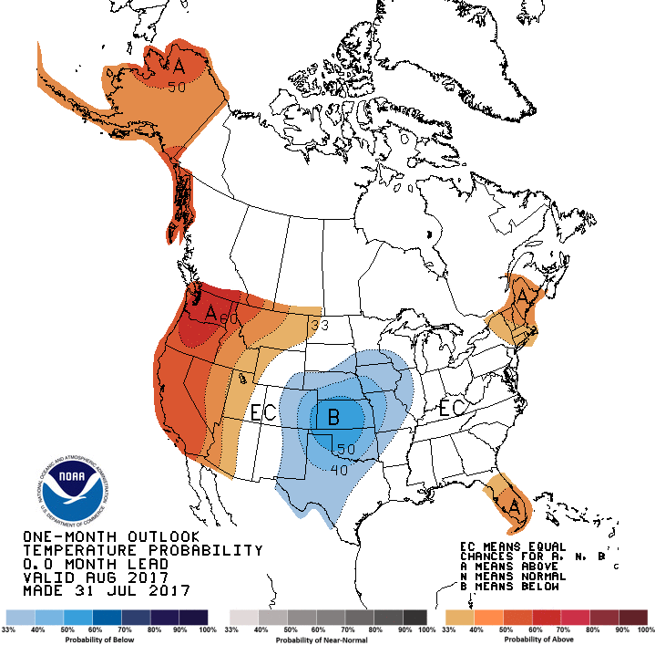 Mentionnons au passage que les prévisions actuelles proposent des températures qui seront plus fraiches qu’à la normale pour les deux prochaines semaines. Le NOAA a aussi révisé hier sa prévision mensuelle pour le mois d’août de températures plus chaudes qu’à la normale à essentiellement des températures dans à sous la normale.