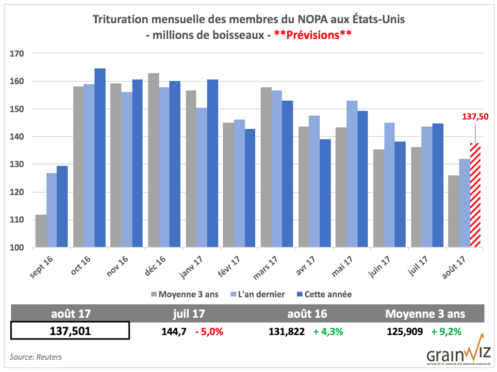 Enfin, ce vendredi, les marchés attendent avec impatience le rapport de trituration mensuelle des membres du NOPA aux États-Unis pour le mois d’août. Selon un sondage de Reuters, ce devrait être en moyenne 137,501 millions de boisseaux qui ont été triturés en août, un sommet inégalé en 10 ans pour ce mois. En juillet, 144,7 millions de boisseaux ont été triturés, mais il est d’usager d’observer un recul de juillet à août.