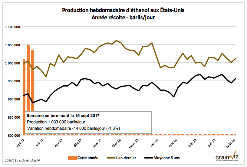Selon le rapport hebdomadaire de l’EIA, la production d’éthanol a été la semaine dernière de 1,033 million de barils/jours, en baisse 14 000 barils/jours par rapport à la semaine précédente, mais toujours au-dessus des niveaux de production de la dernière année.