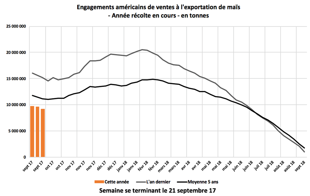 Si les résultats de vendredi dernier ont été en quelque sorte positifs comparativement aux prévisions des marchées, ils soulignent également de nouveau combien les stocks américains débutent la nouvelle année commerciale (2017-18) a des niveaux très élevés. À priori, ceci n’est rien de nouveau, mais les récoltes en cours aux États-Unis laissent planer aussi un risque que les rendements se révèlent mieux que prévu. C’est ce que signalent d’ailleurs depuis la semaine dernière plusieurs producteurs qui récoltent leurs champs. Seul élément d’incertitude à ce stade-ci, que les récoltes déçoivent davantage alors qu’elles progressent plus au nord du Midwest américain.