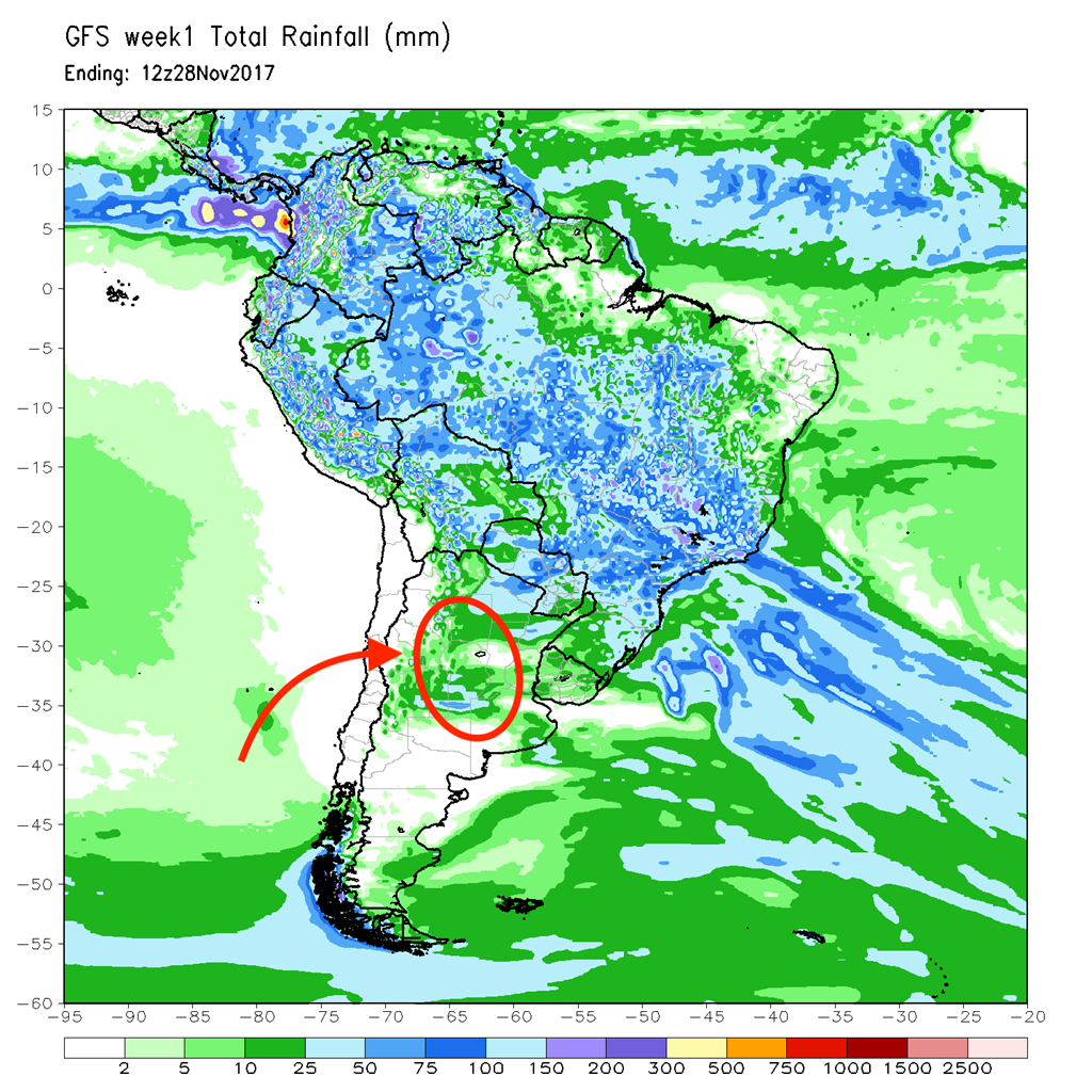 Du côté de l’Amérique du Sud, une certaine nervosité se fait toujours sentir pour le début de saison, spécialement en Argentine où des conditions très sèches retiennent l’attention. La dernière semaine aura été chaude et sèche, et l’arrivée de La Nina laisse toujours planer un risque de conditions encore très sèches au cours de la saison qui n’en est qu’à ses débuts.