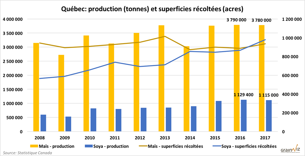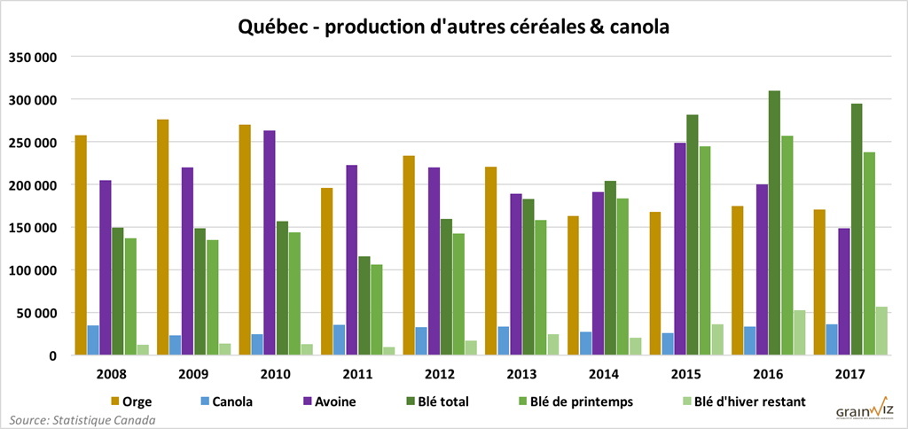 Au Québec, Statistique Canada propose un recul des récoltes de maïs et soya de respectivement -0,3% à 3,78 millions de tonnes et -2% à 1,115 million de tonnes. Historiquement, ces volumes récoltés demeurent néanmoins à des sommets. Après 5 ans de progression annuelle, malgré le regain de production de blé d’hiver, le total de volume de production de blé au Québec affiche également en recul de près de 5% à 295 000 tonnes.