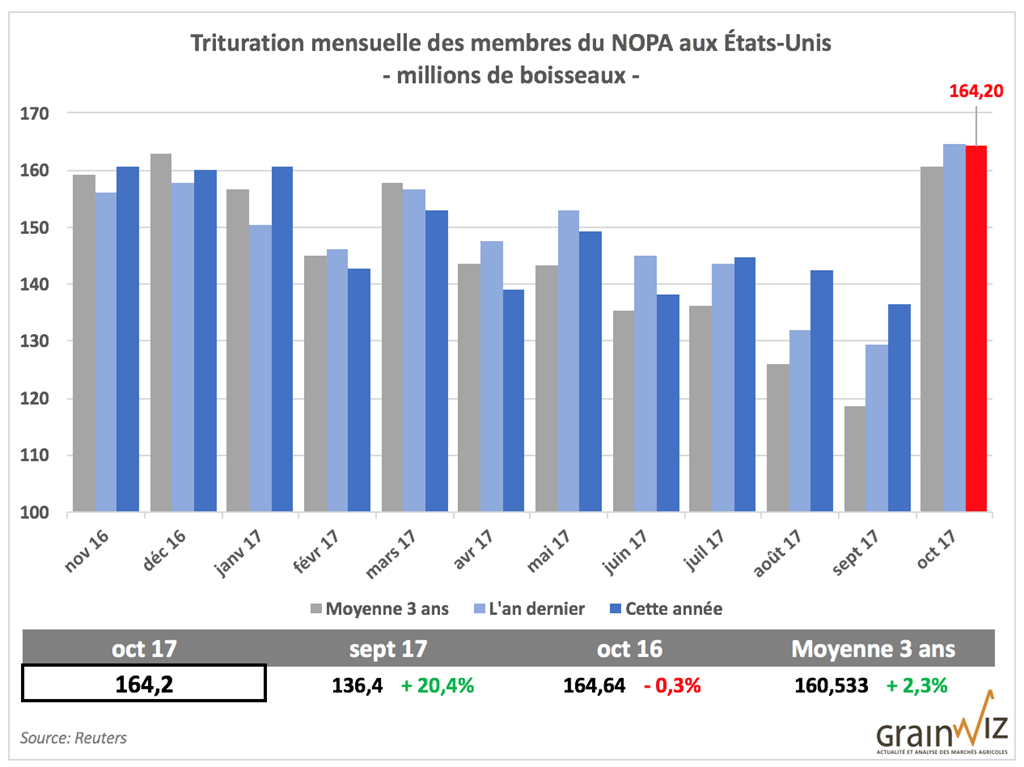 À surveiller, ce vendredi, le rapport mensuel de trituration des membres du NOPA aux États-Unis. Rappelons qu’à l’hiver et au printemps dernier, le rythme de trituration mensuelle de soya avait déçu, mais a depuis repris en force dans les derniers mois.