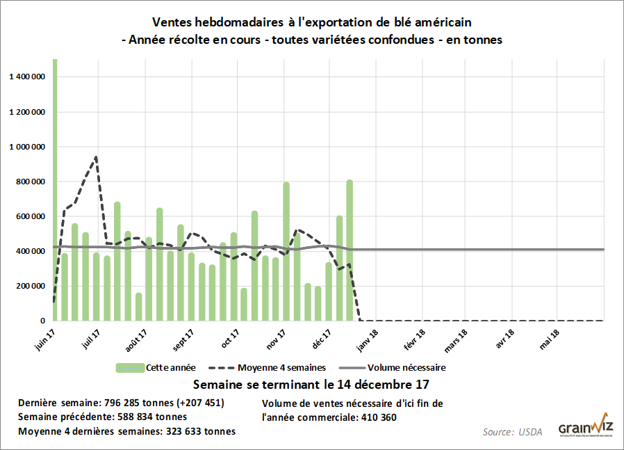 Les chiffres hebdomadaires d’exportation de maïs américain continuent de prendre du mieux, s’établissant à 1,56 million de tonnes pour la semaine se terminant le 14 décembre. Il s’agit d’un résultat qui a dépassé les attentes des marchés (0,8 à 1,1 mil. de tonnes), et constitue un 3e sommet depuis le début de l’année commerciale 2017-18.