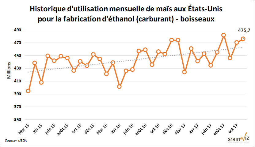 Le marché du maïs gagne timidement de la traction. Le dernier rapport mensuel de transformation de grains du USDA (Grain crushings) a révélé une utilisation de 475,7 millions de boisseaux de maïs en novembre dernier aux États-Unis, en hausse de +5,2% par rapport à novembre 2016, un 4e mois d’utilisation nettement plus élevé que dans les dernières années, et un second sommet suivant le record d’utilisation de maïs pour l’éthanol atteint en août dernier de 481,54 millions de boisseaux.