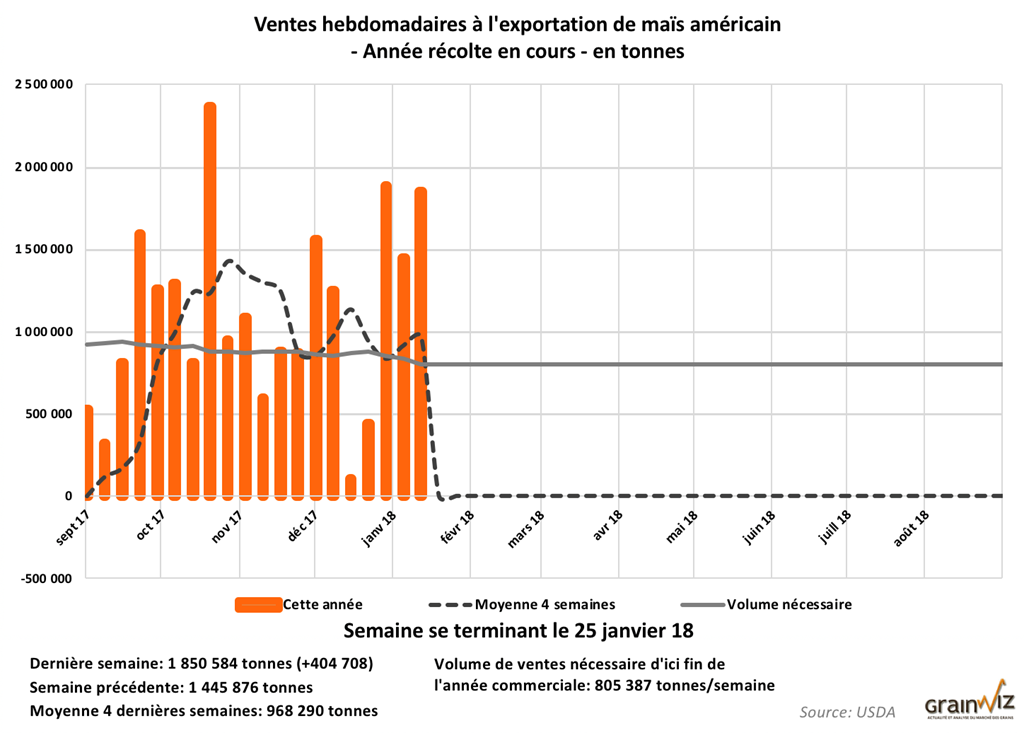 Selon le USDA, les ventes à l’exportation de maïs US de 2017/2018 ont été de 1 850 millions de tonnes la semaine dernière, plus que les anticipations des marchés de 1,00 et 1,50 million de tonnes et le 3e plus important volume de ventes à l’exportation de maïs américain depuis le début de l’année commerciale 2017-18 (1er sept.). Déjà que dans les derniers jours, trois annonces de ventes intéressantes à l’exportation de maïs américain ont été annoncées par le USDA, nul besoin de dire que ce rapport ne fait qu’ajouter à la tournure positive des perspectives d’exportations américaines de maïs.