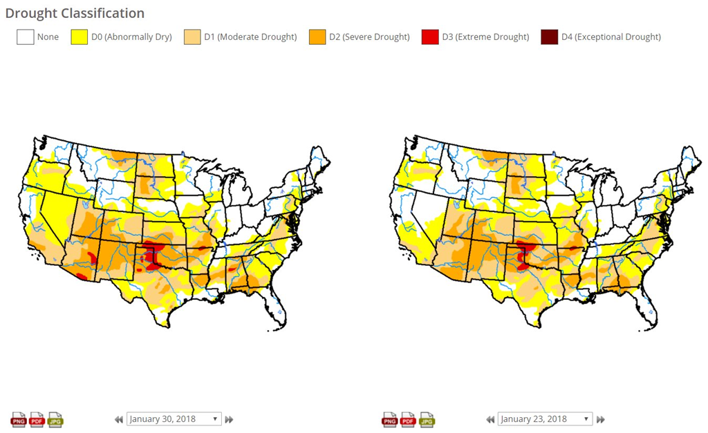 Aux États-Unis, la sécheresse semble se stabiliser plus au nord. Par contre, dans le sud des Plaines, particulièrement dans les États du Texas, de l’Oklahoma et du Kansas, elle continue de s’étendre. Sachant que ces trois États sont d’importantes régions de production de blé d’hiver, il y a matière à s’inquiéter.