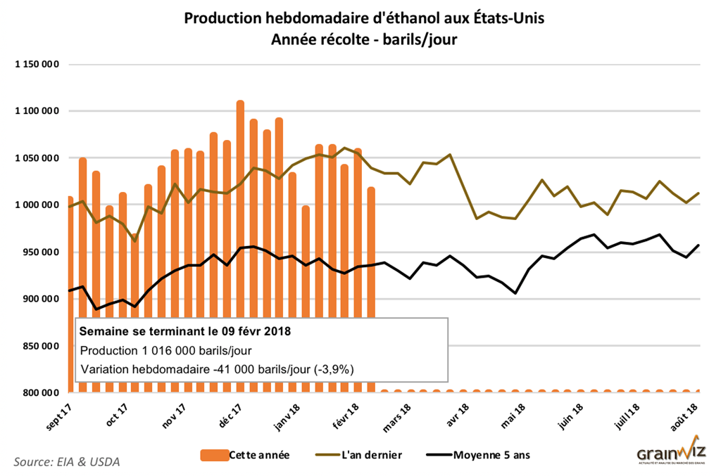 Aux États-Unis, la production d'éthanol a été de 1 016 millions de barils par jour la semaine dernière alors qu'elle était de 1 057 millions de bpj la semaine précédente. Depuis maintenant 7 semaines, le chiffre hebdomadaire de production d'éthanol aux États-Unis déçoit. Il faut maintenant surveiller davantage cette situation de plus près, puisqu'un ralentissement de la demande de maïs de ce côté ne serait pas favorable pour les prix. Quant aux stocks d'éthanol, ils ont reculé de 23,5 millions de barils à 22,9 millions de barils.