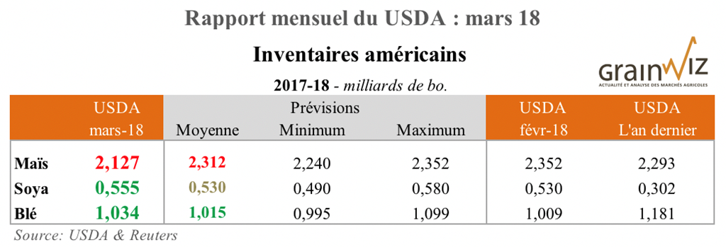 - Au net, les stocks américains de maïs 2017-18 sont abaissés de 2,352 à 2,127 milliards de boisseaux, nettement plus que la moyenne de prévision des marchés (2,312 mil. de bo.), ce qui est positif.