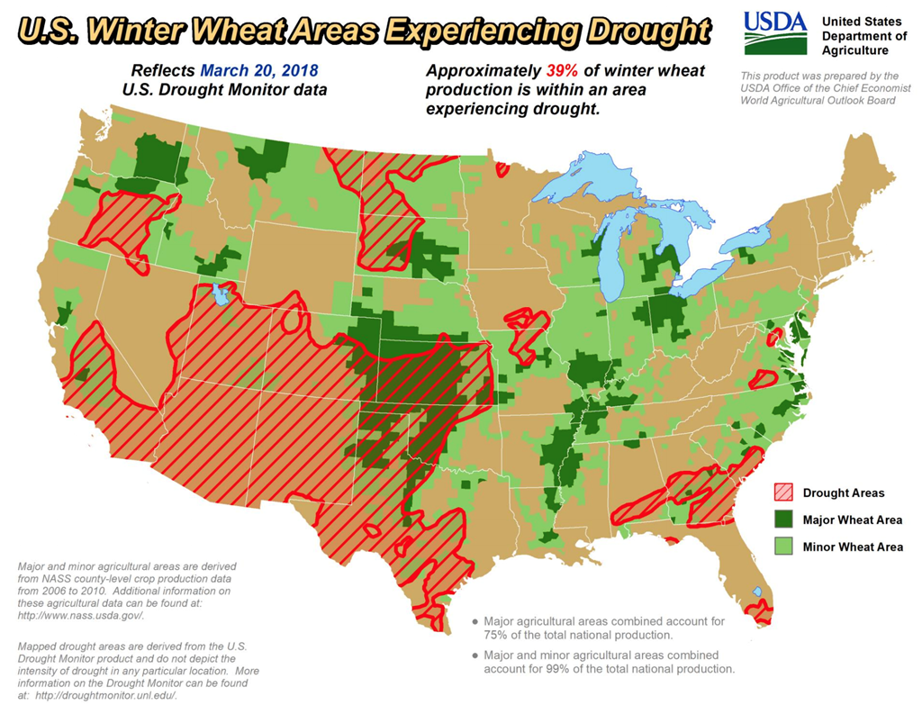 Selon la dernière mise à jour de la carte de sécheresse aux États-Unis, 39% des cultures de blé d’hiver sont exposées à la sécheresse, en baisse de 1% par rapport à la semaine dernière. Les prévisions météo proposaient jusqu’ici des précipitations dans les régions les plus asséchées, mais la dernière mise à jour révèle qu’elles devraient être maintenant observées plus à l’est que prévu.