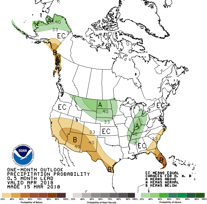 Concernant la météo, la prévision actuelle du NOAA suggère des conditions un peu plus humides qu’à la normale pour le mois d’avril principalement dans l’est du Midwest américain. Certains analystes s’interrogent déjà à l’idée que le début de saison pourrait être trop humide, bien qu’il apparait prématuré d’envisager que ce soit le cas alors qu’il reste encore quelques semaines avant le début des semis.