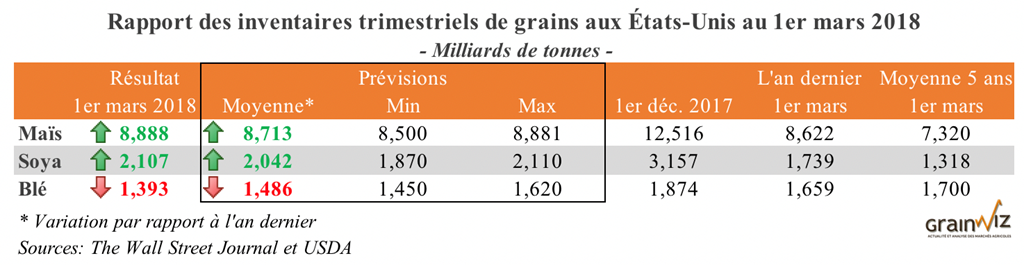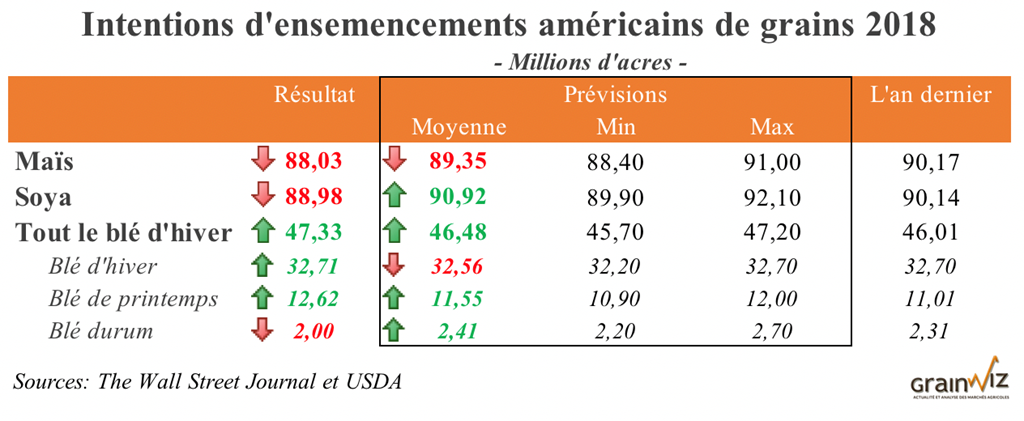 Le USDA a publié ce midi ses rapports très attendues des marchés. Voici brièvement les résultats. Bien entendu, la principale surprise est sans équivoque le soya, avec un recul des ensemencements américains alors que les marchés anticipaient une hausse. Le blé ne donne pas sa place, le USDA révèlant que les producteurs ont l'intention de semer plus de blé que prévu.