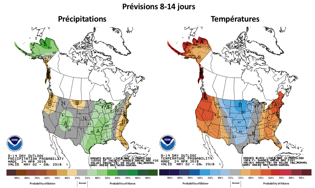 Côté météo, pour le maïs et le soya, les conditions apparaissent toujours excellentes pour accélérer les ensemencements cette semaine. Heureusement, ces conditions avaient été déjà partiellement anticipées des marchés tout au long de la dernière semaine, ce qui avait déjà forcé les prix à encaisser un bon recul. Dans ce même ordre d’idée, les prévisions 6-10 puis 8-14 jours proposent un retour à des conditions légèrement plus humides qu’à la normale, ce qui aura certainement apporté un peu de support aux prix, spécialement le maïs.