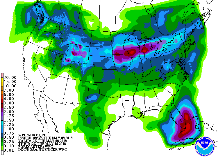 Les conditions météo demeurent dans l’ensemble favorables aux ensemencements et à l’émergence des cultures aux États-Unis. Pour les prochains jours, des précipitations régulières pourraient ralentir quelque peu les travaux aux champs, spécialement dans les régions du Midwest entourant les Grands Lacs. Par contre, les prévisions proposent un retour à des conditions plus sèches à partir de la semaine prochaine.