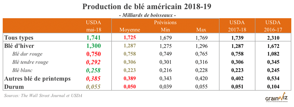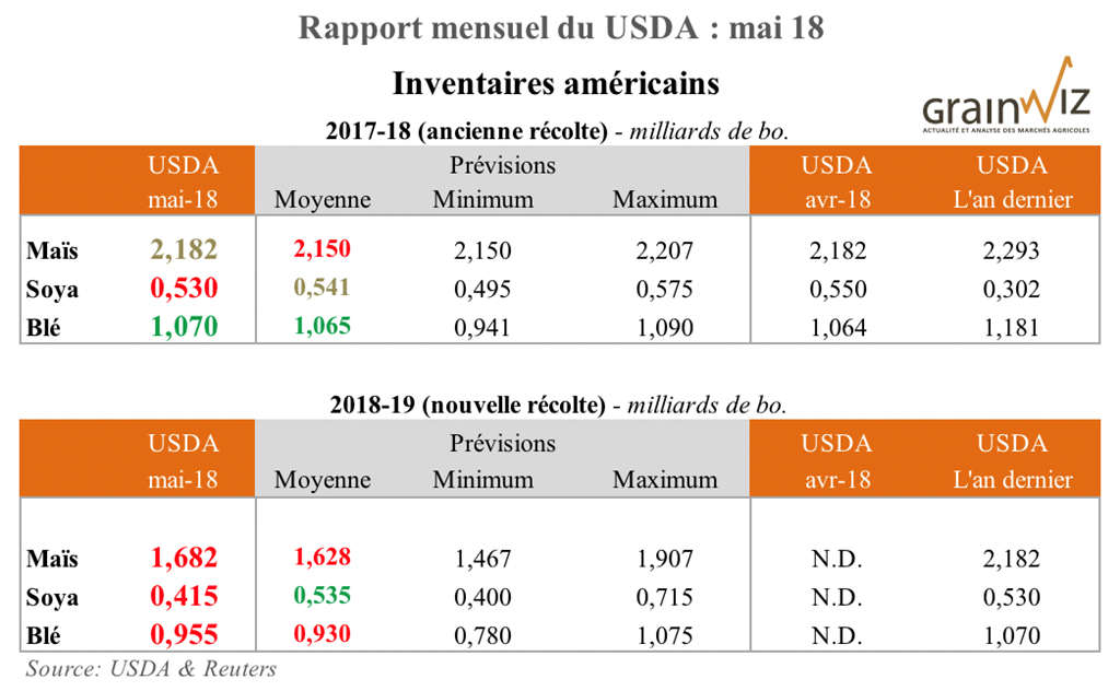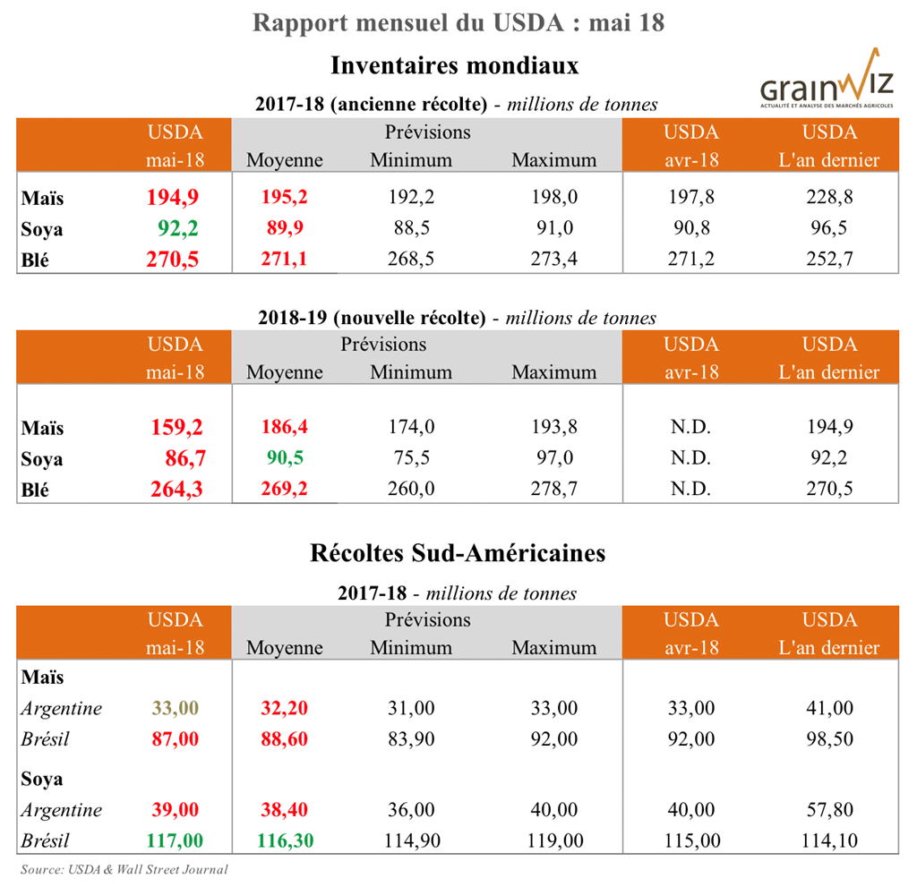 Le USDA a présenté ce midi son rapport mensuel de mai 18 qui était particulièrement attendu. En effet, c’est avec la publication de ce rapport que l’instance américaine propose pour la 1re fois des projections pour la prochaine année (2018-19). Voici brièvement quelques points intéressants :
