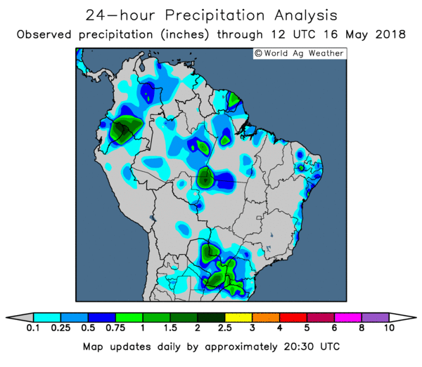 Aux États-Unis, dans le sud des Plaines, des précipitations sont attendues, mais apparaissent insuffisantes et incertaines pour les prochains jours. On rapporte aussi de la grêle et de forts vent qui pourraient avoir endommagés les cultures au Kansas. Plus au nord, les conditions plus humides pourraient de nouveau ralentir la fin des ensemencements, bien qu’on rapporte que certains producteurs devraient les avoir maintenant complétés.