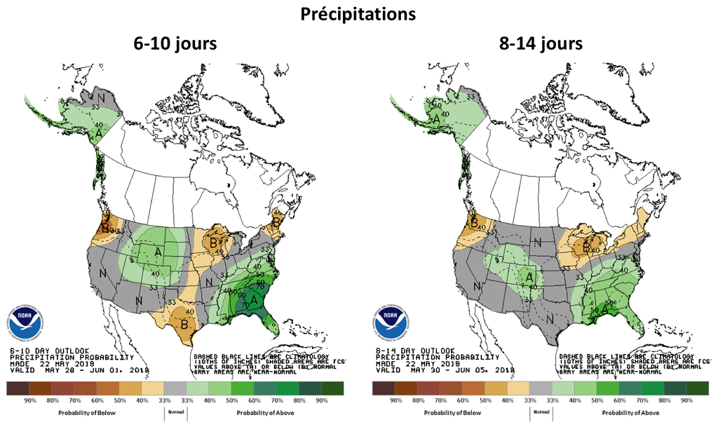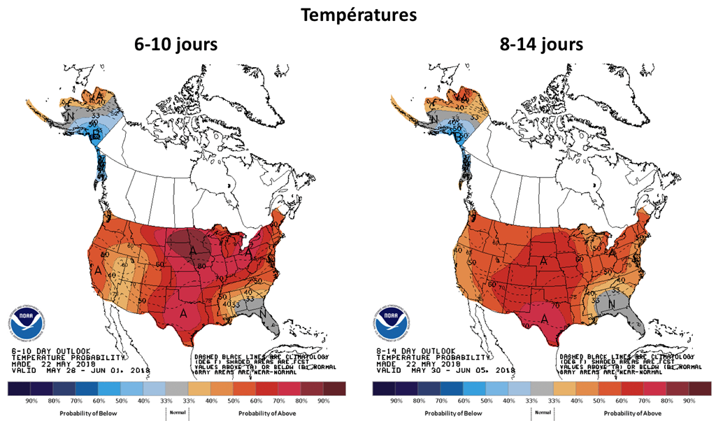 Pour les prochains jours, des précipitations régulières sont prévues pour une bonne proportion des régions de productions aux États-Unis. Cependant, les marchés ont à l’œil les prévisions 6-10 puis 8-14 jours qui proposent toujours des températures nettement au-dessus des normales saisonnières, avec peu de précipitations à prévoir au cours de cette période.