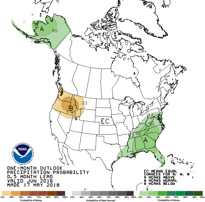 Si on pouvait douter qu’il y avait peut-être une tendance vers une sécheresse au cours du mois de juin, à priori, les prévisions actuelles penchent maintenant en faveur de conditions dans la normale et très favorables pour le développement des cultures aux États-Unis. Ceci concorde avec la dernière prévision mensuelle du NOAA pour le mois de juin.