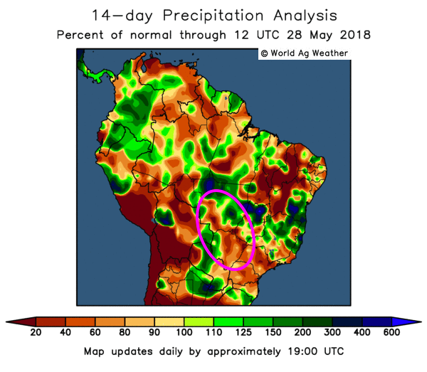Au Brésil, les marchés ont toujours à l’œil les conditions de fin de saison pour la 2e production en maïs de l’année. De bonnes précipitations ont eu lieu il y a deux semaines plus au sud, mais depuis, les conditions demeurent anormalement sèches plus au nord. Plusieurs organisations continuent de revoir à la baisse leur projection de récolte brésilienne de maïs, certains à moins de 80 millions de tonnes, le USDA se situant actuellement à 87 millions de tonnes.