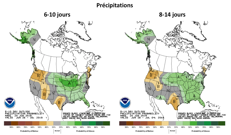 Côté météo, les prévisions actuelles se suivent et se ressemblent pour le Midwest et les Plaines américaines avec des précipitations régulières prévues encore pour les 2 prochaines semaines, et des températures anormalement chaudes qui devraient persister jusqu’au début juillet.