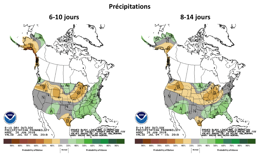 Côté météo, les dernières prévisions pour cette semaine sont toujours jugées dans l’ensemble très favorables pour les cultures américaines avec des précipitations régulières et des températures un peu plus chaudes qu’à la normale. Par contre, une certaine nervosité s’installe. Plus au nord, on rapporte des conditions excessivement humides dans certaines régions du Midwest. De plus, sur un horizon de 6-10 et 8-14 jours, des précipitations sous les normales accompagnées de températures nettement au-dessus des normales sont attendues à partir de la fin de semaine.
