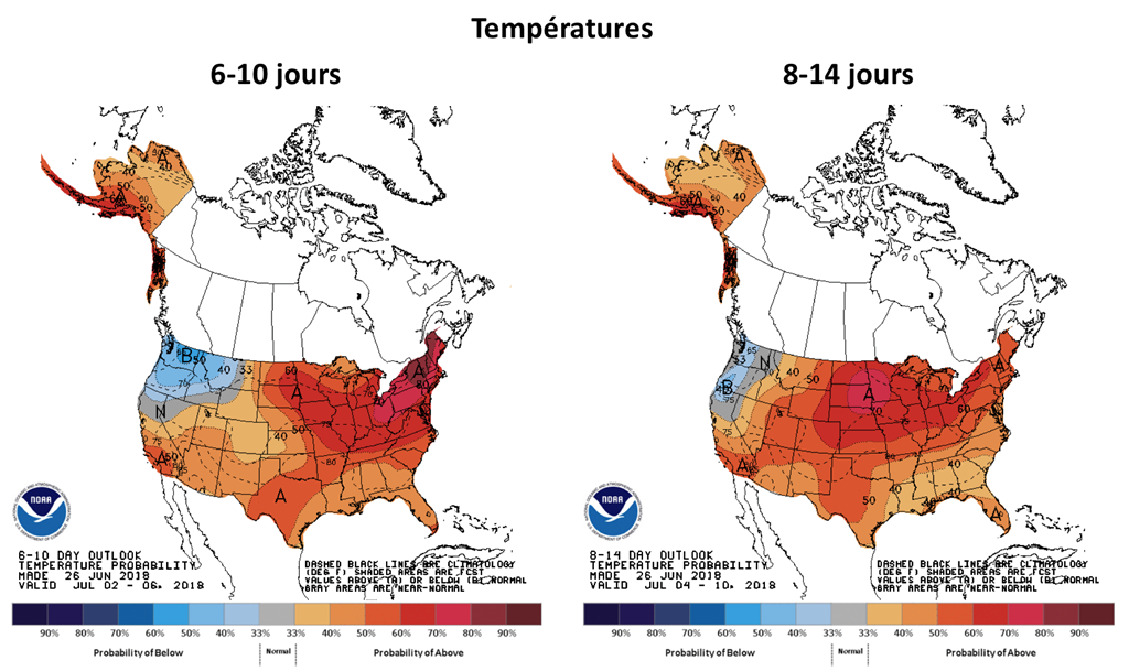 Toute la question est maintenant à savoir si d’une part, les récentes précipitations auront été suffisantes pour permettre aux cultures d’affronter ces conditions dans les régions plus asséchées, et d’autre part si les températures très chaudes viendront affecter ou non les cultures au moment clé de la pollinisation dans le maïs.