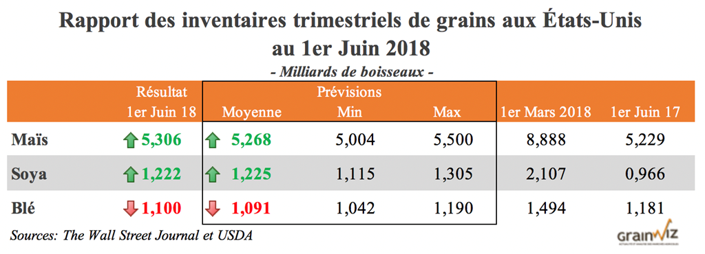 Le rapport des stocks trimestriels de grains américains au 1er juin se veut plus "neutre" avec des résultats essentiellement dans les attentes des marchés, bien que ceux de maïs se situent au-dessus de la moyenne des anticipations.