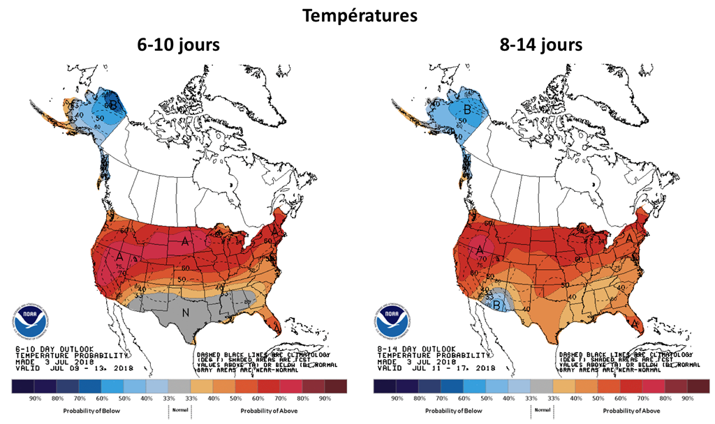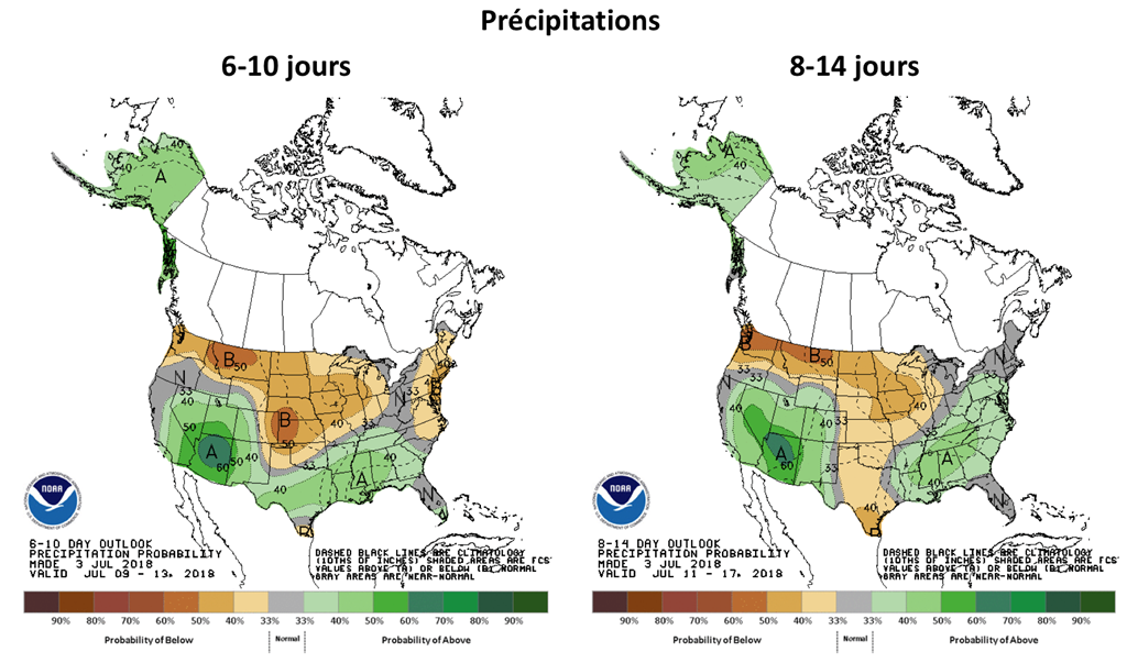 Par contre, une certaine nervosité flotte dans l’air avec plusieurs nouvelles taxes commerciales qui entrent/entreront en vigueur au cours des prochains jours, notamment celles américaines sur les importations de plusieurs produits chinois (6 juillet). De plus, les conditions météo s’annoncent très chaudes et sèches pour plusieurs régions du Midwest et des Plaines américaines au cours des 2 prochaines semaines alors que les cultures de maïs arrivent au stade de la pollinisation.