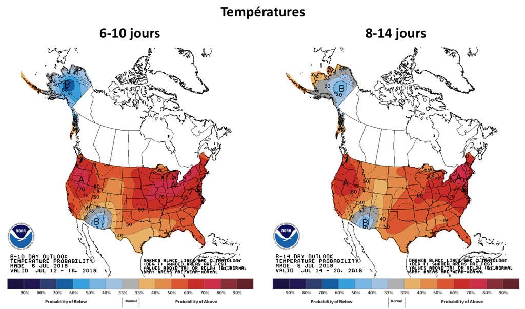 On constate cependant des prévisions de retour à des précipitations dans la normale saisonnière pour les deux prochaines semaines sur pratiquement l’ensemble du Midwest américain. Avec les bonnes réserves d’eau accumulées au cours du mois de juin, le seul risque apparait du côté des températures nocturnes trop chaudes qui pourraient nuire à la pollinisation.