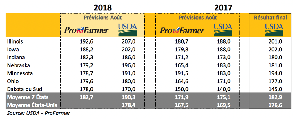 Ceci donne écho aux dernières prévisions du USDA du mois d'août qui propose aussi une moyenne de rendement record dans le maïs de 178,4 boisseaux/acre, et pratiquement record pour le soya à 51,6 boisseaux/acre, seulement -0,4 de moins que le record de 2016.