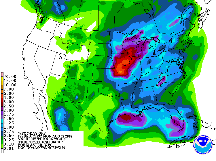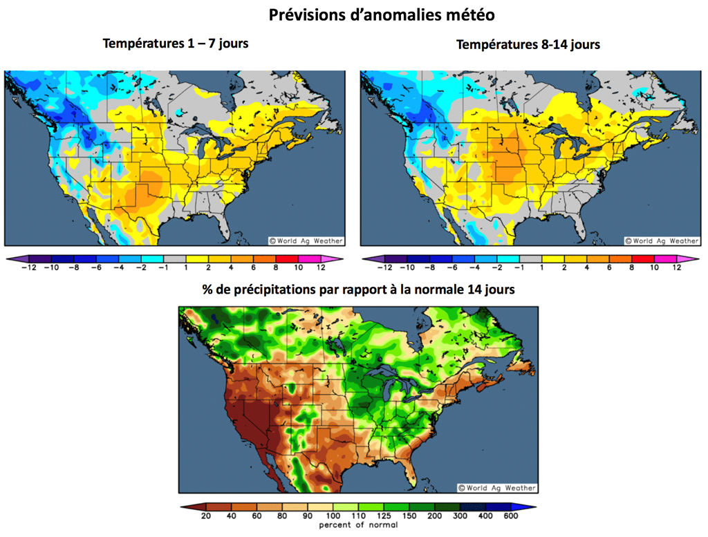 Les prévisions météo du QPF (Quantitative Precipitation Forecast) des 5 prochains jours indiquent que les averses dans le Corn Belt devraient se concentrer en Iowa, en Illinois, au Minnesota et au Missouri.