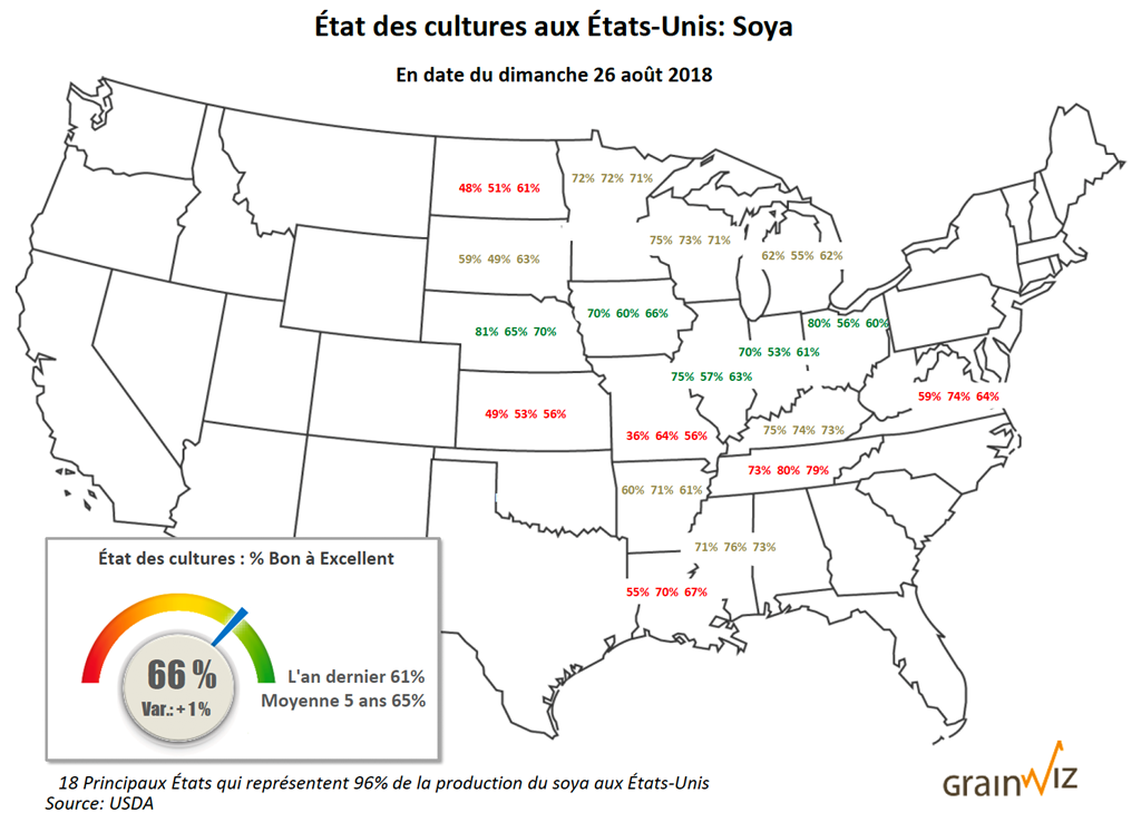 Le NASS (USDA) a rapporté qu’en date du dimanche le 26 août dernier, 95 % des cultures de soya américain avaient passées le stade du remplissage des gousses. Il estime également que 7 % de la récolte ont perdu leurs feuilles. La normale est de 4 % pour cette période-ci de l’année. Les conditions de culture se sont améliorée de 1 % à 66 % dans les catégories «bon à excellent».