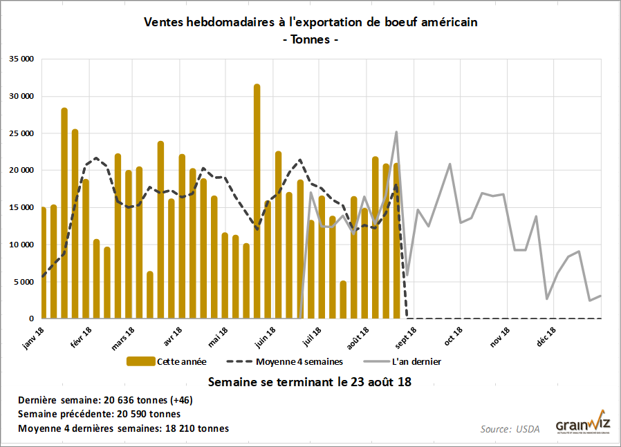 Le USDA a rapporté ce matin des ventes privées à l’exportation de 100 611 tonnes de maïs américain 2018/2019. La destination était le Mexique. Pour la semaine du 23 août dernier, les ventes à l’exportation de l’ancienne récolte de maïs US, compilées par le FAS (USDA), ont été de 175 448 tonnes, soit à un résultat légèrement supérieur à la semaine précédente. C’était aussi au milieu des attentes du marché. Dans le cas de la nouvelle récolte, le FAS estime les ventes à 524 987 tonnes, un chiffre qui se trouvait dans les prévisions du marché. Les chargements à l’exportation ont totalisé 1,344 million de tonnes cette semaine, ce qui représenterait une hausse de 2,4 % par rapport à la semaine précédente.
