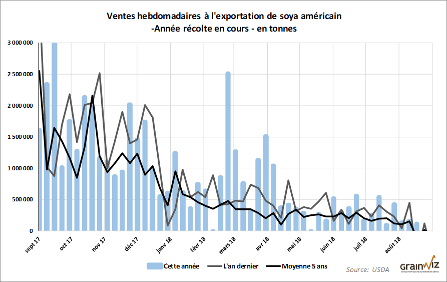 Ce matin, le FAS a indiqué que dans la semaine du 23 août dernier, 110 914 tonnes de l’ancienne récolte de soya américain ont été vendues à l’exportation. Il reste une semaine pour l’année commerciale 2017/2018. Dans le cas de la nouvelle récolte de 2018/2019, 591,553 tonnes ont été vendu, soit presque la moitié de ce que c’était la semaine précédente. C’était aussi une baisse de 62,1 % par rapport à l’an dernier. Mais, les ventes à terme totales de la nouvelle récolte restent toujours supérieures de 14,9 % par rapport à la même semaine l’an passé. Par ailleurs, les ventes à l’exportation de tourteau de soya américain ont totalisé 478 549 tonnes, une nette réduction de 21 499 tonnes pour 2017/2018. Les ventes à l’exportation d’huile ont été de 24 023 tonnes.