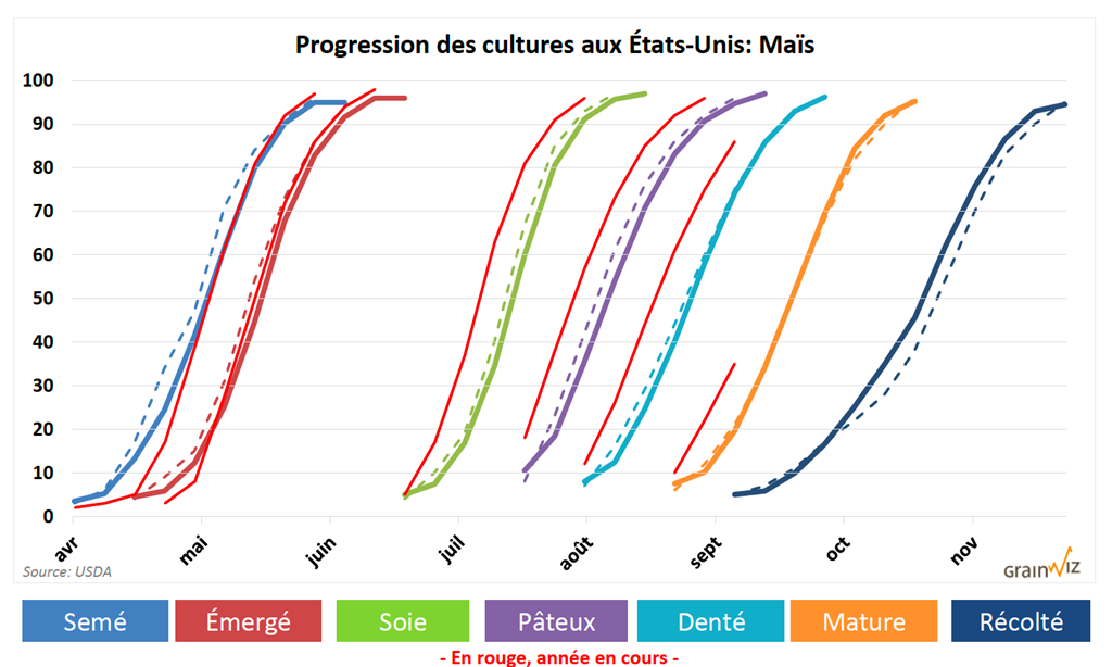 Le rapport sur l’état des cultures américaines, qui fut présenté ce matin, indiquait qu’en date de dimanche dernier, 35 % de la récolte de maïs était mature. La moyenne pour cette période de l’année est de 21 %. La récolte de maïs US est également complétée à 5 % alors que la moyenne des 5 dernières années est de 3 %. Par ailleurs, l’état des cultures de maïs indiquait une amélioration de 1 % à 68 % dans les catégories «bon à excellent».