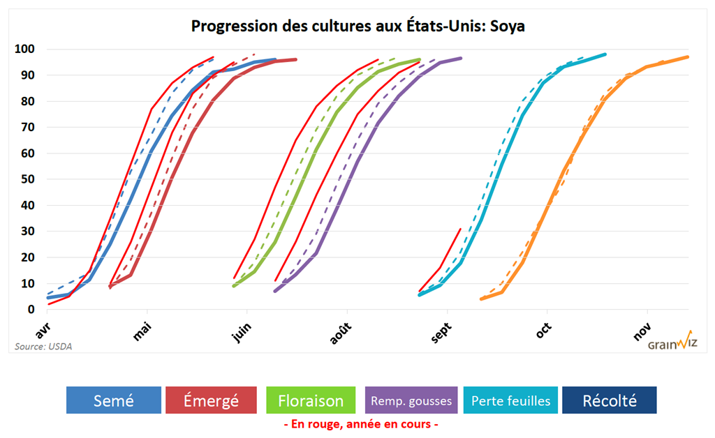Le rapport sur l’état des récoltes de soya américain a indiqué qu’en date de dimanche dernier, 31 % de la récolte avaient perdu leurs feuilles. La moyenne pour cette période de l’année est de 19 %. Aussi, 68 % de la récolte seraient dans les catégories «bon à excellent», soit en amélioration de 2 % par rapport à la semaine précédente.