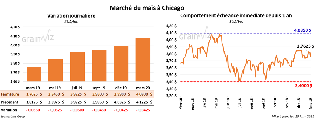 La majorité des contrats de maïs à Chicago ont clôturé avec des pertes de 5 à 5 ¾ cents. En raison de la fermeture partielle du gouvernement fédéral américain, le rapport mensuel d’offre et de demande du USDA ne sera pas présenté demain.