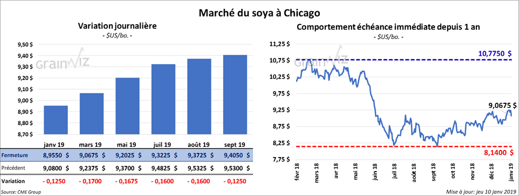 La plupart des contrats de soya à Chicago ont terminé la journée en baisse de 16 à 17 ¼ cents. Le tourteau a suivi la même direction en perdant 6,40 $/tonne. L’huile a reculé de 38 points.
