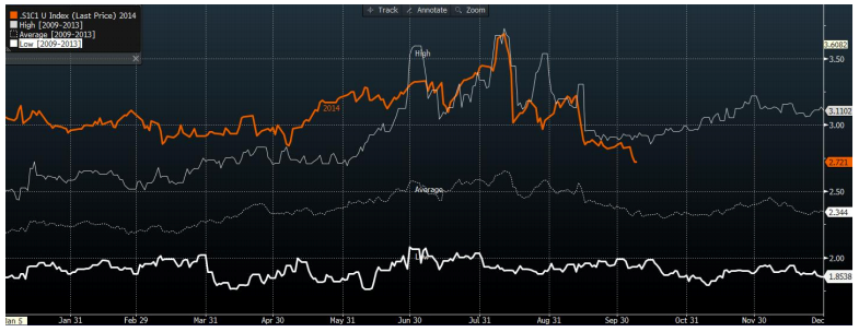 - Ratio fève soya / maïs : toujours dans le haut historique