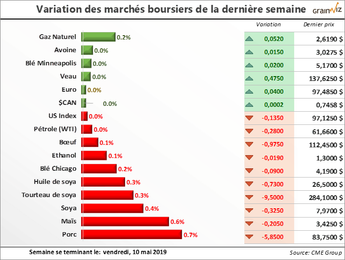 Maïs - La dernière semaine donnait espoir d'un retour à la hausse intéressante des prix à Chicago pour le marché du maïs. À seulement 23% de semé aux États-Unis au 5 mai dernier, les ensemencements américains sont les plus tardifs depuis 2013, ce qui alimentait et alimente toujours l'idée que les superficies cultivées cette année et/ou rendements américains seront moins importants. Par contre, les prévisions météo pour cette semaine proposent maintenant une bonne fenêtre de conditions sèches pour rattraper le temps perdu dans le Midwest américain.