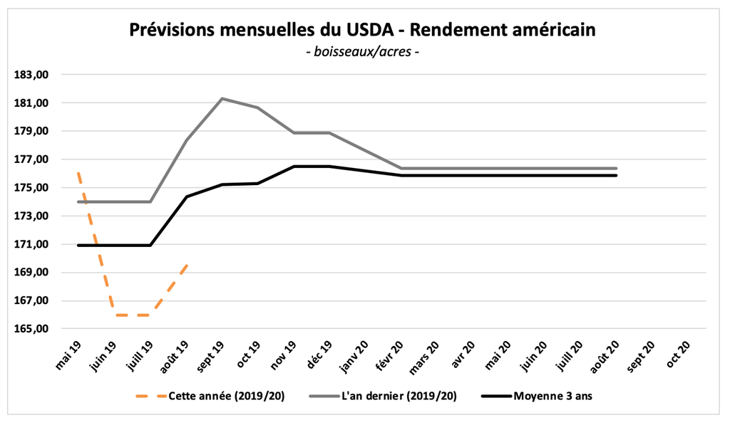 Le rendement prévu cette année aux États-Unis à 169,5 bo./acre demeure nettement sous les niveaux des dernières années, mais s'annonce mieux que ce qui était anticipé jusqu'ici.