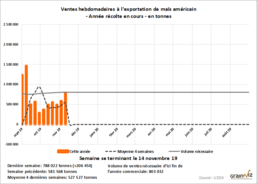 Les ventes hebdomadaires à l'exportation de maïs américain ont bondi à leur plus haut depuis le début septembre dernier.