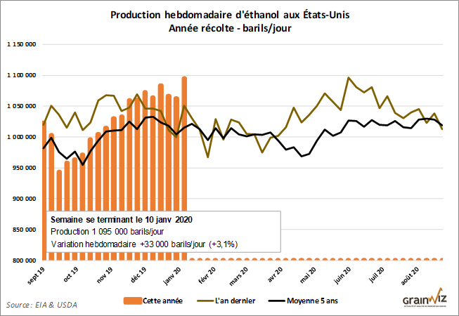- La production hebdomadaire d'éthanol demeure vigoureuse aux États-Unis, atteignant son plus haut niveau depuis juin dernier.