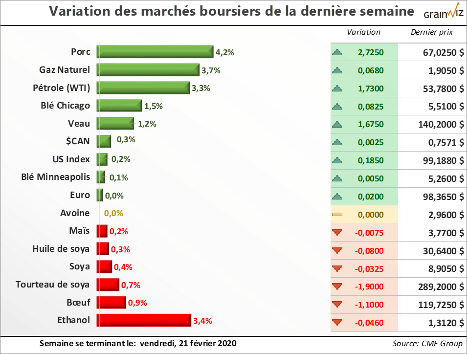 Les dernières semaines auront été excellentes du côté des ventes à l'exportation de maïs américain. La production hebdomadaire d'éthanol est également intéressante depuis un bon moment, bien qu'on se méfie maintenant des stocks américains d'éthanol en forte hausse... Enfin, considérant la fermeté persistante des bases américaines, et du rythme élevé de production de porc, volaille et boeuf aux États-Unis, on peut facilement dire aussi que la demande... Pour en savoir plus sur la situation actuelle et la tendance des marchés des grains et des viandes au Québec, lisez la suite dans la dernière édition du 24 février 2020 de la lettre financière.