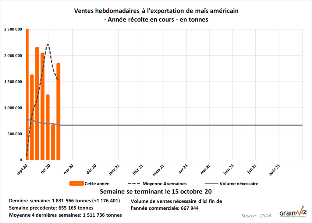 Nouveau rebond important des ventes à l'exportation de maïs américain pour la semaine se terminant le 15 octobre.
