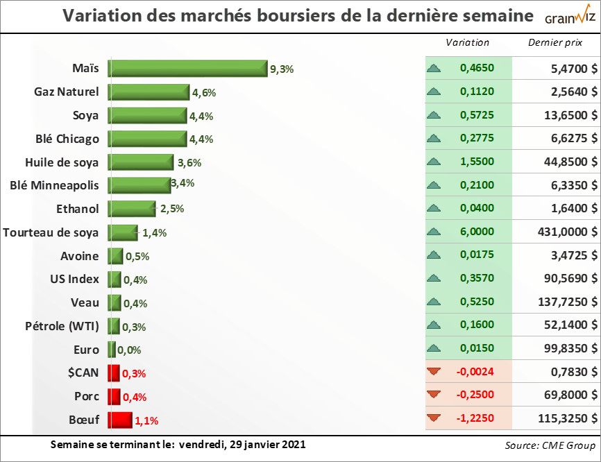 Maïs - Alors que ce fût le soya qui aura été en tête de peloton pendant un bon moment, tout au long de l'automne dernier, c'est maintenant le maïs qui prend les devants. L'échéance immédiate à Chicago (CàT mars 21) gravite à son plus haut depuis juin 2013, à plus de 5,50 $US/bo.. On note en ce sens le ratio soya/maïs à Chicago également en forte baisse depuis une semaine, passant de plus de 2.6, à l'avantage du soya, à moins de 2,4, penchant rapidement en faveur du maïs.