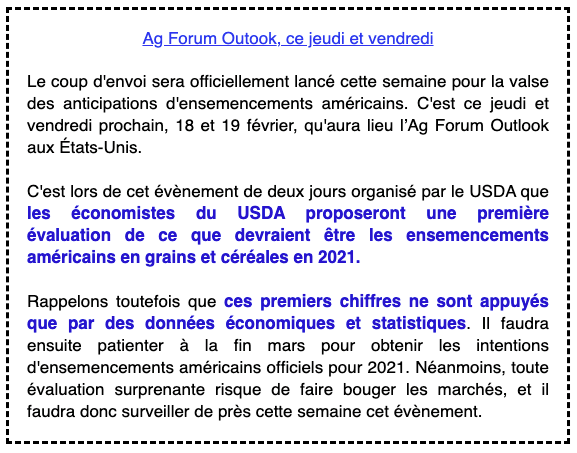Le rapport mensuel du USDA aura déçu, avec une révision très modeste des exportations américaines de maïs à la hausse de +0,05 à 2,6 milliards de boisseaux, et des stocks américains réduit de seulement -0,05 à 1,502 milliards de boisseaux. Considérant les fortes ventes à l'exportation de maïs américain à la Chine, l'avance toujours considérable également dans les ventes cumulatives à l'exportation de maïs américain,...