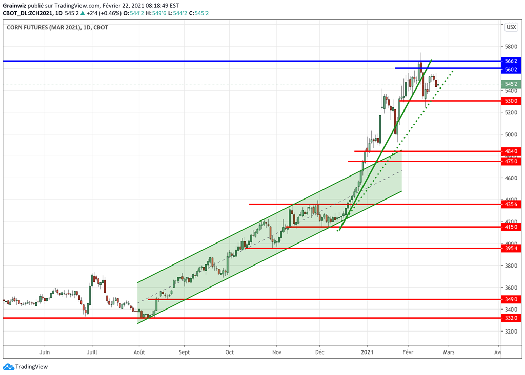 Le marché du maïs ancienne récolte (CàT Mars 21 à Chicago présentement) hésite toujours.