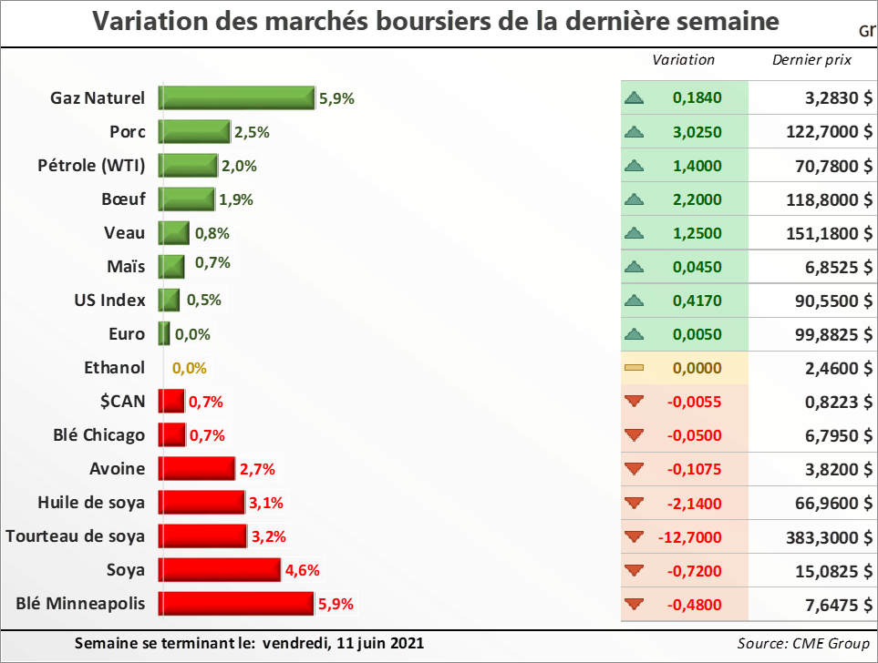 Les stocks américains de maïs continuent ainsi de reculer, ce qui devrait supporter pour encore un moment le marché. Considérant que le USDA utilise un rendement record de 179,5 bo./acre pour faire grimper les stocks américains de maïs l'an prochain, il y a certainement matière... Pour en savoir plus sur la situation actuelle et la tendance des marchés des grains et des viandes au Québec, lisez la suite dans la dernière édition du 14 juin 2021 de la lettre financière.