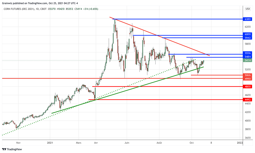 Maïs - Le contexte demeure constructif pour le marché du maïs à Chicago qui le rend bien, celui-ci laissant toujours entendre que des creux saisonniers définitifs ont bel et bien été atteints en septembre dernier, avec un support important qui persiste à l'approche de 5,00 $US/bo. (CàT Déc. 21). Fondamentalement, plusieurs éléments intéressants endossent cette fermeté:
